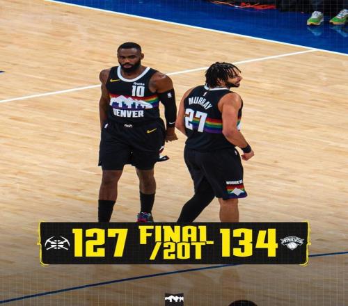第2个加时赛里,约基奇远投三不沾,穆雷抢断布伦森后完成暴扣。布伦森背身单打取分,随后2罚1中,穆雷、约基奇相继外线打铁,布伦森轰进三分球。穆雷失误,沙梅特空切上篮打进,布鲁斯布朗抛投得手。布里奇斯轰进远投,约基奇3罚1中,随后抢下前场篮板,小哈达威轰进三分球为掘金续命。布伦森抛投得分,丹佛落后5分并请求暂停。约基奇外线打铁,布伦森2罚全中,穆雷远投不进,比赛时间走完。最终,尼克斯以134比127力擒掘金,得以豪取8连胜。丹佛吞下了3连败。