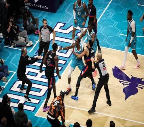 活塞客战黄蜂,第三节7分06秒,杜伦背打造成迪亚巴特犯规。两人发生口角后,迅速演变为顶牛。杜伦推开迪亚巴特后,后者欲挥拳反击但落空!随后迪亚巴特躲过多人拦截奔袭再次攻击杜伦,升级为多人超大冲突!布里奇斯挥拳击打杜伦胸口,杜伦回拳反击。斯图尔特从替补席杀出,多次挥拳袭击小乔。 布里奇斯 低头躲过第一击,随后频频后退闪躲。众人围成一团后,斯图尔特紧抓小乔不放,抬手连续挥拳击打。