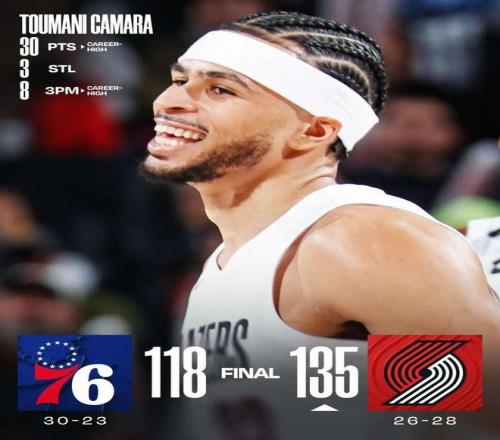 开拓者大胜76人 杨瀚森2分1篮板