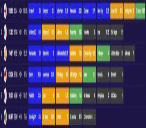 欧战前六联赛本赛季欧战生存状态,蓝色为欧冠,黄色为欧联,绿色为欧协,黑色为出局。