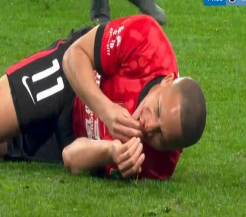 第15分钟,姜至鹏边线肘击韦林顿,主裁判先是向姜至鹏出示黄牌。回看慢镜头之后,主裁判改判红牌。