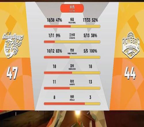 这一节两队你追我赶,广东和天津的单外援阵容打的不亦乐乎,场上菜鸡互啄,半场战罢广东凭借奎因萨姆纳半场合力砍下的33分,艰难47-44领先天津,上半场广东三分11中1,本土球员仅得10分,天津飚进5记三分,本土球员拿到23分,谷泽裕半场13分8助,一人打爆胡明轩杨溢