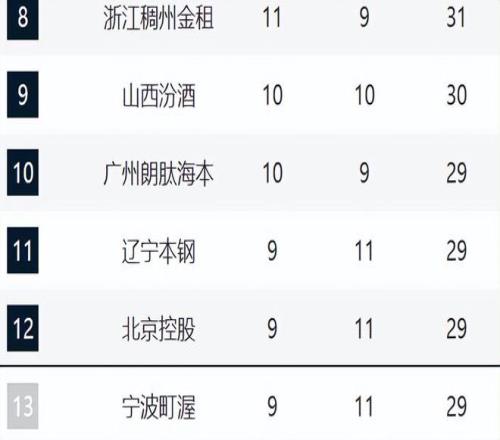 11-13分别是辽宁、北控和宁波。辽宁这轮大胜四川,止住颓势。北控最近的趋势越来越好,内线暴走的情况下,全队都被盘活,现在已经两连胜了。宁波最近遭遇两连败,这段时间攻守一塌糊涂。