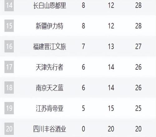 14-20分别是吉林、新疆、福建、天津、同曦、江苏和四川。吉林、福建和新疆这轮全部都输球了,特别是新疆好不容易崛起,这轮却最后时刻崩盘输给同曦。至于吉林和福建,相比于赛季初期,他们的排名还在持续下滑。天津现在已经三连败,同曦即便这轮取胜,但他们目前也就6胜,他们的状态需要巩固住。江苏最近状态非常好,10场赢了4场,可惜这轮输给了浙江。四川已经20连败。