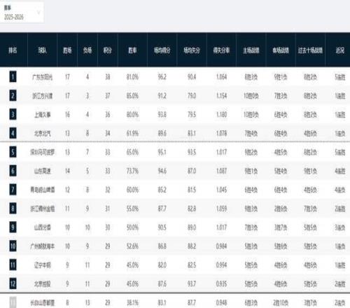 CBA最新排名,广东升至第一,首钢队第四,辽宁重回季后赛