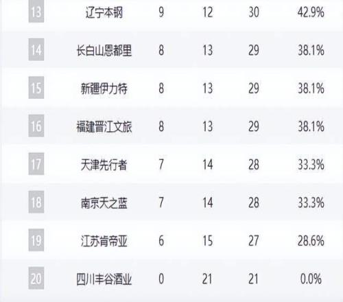 辽宁队作为四冠王,战绩滑落至9胜12负,排名跌至第13位,赛季表现远低于预期。福建队、新疆队、吉林队同为8胜13负,陷入中游泥潭。同曦队(7胜14负)、天津队(6胜15负)、江苏队(5胜16负)与四川队(0胜21负)则深陷倒数深渊,其中四川队已遭遇21连败,创CBA历史最差开局纪录。