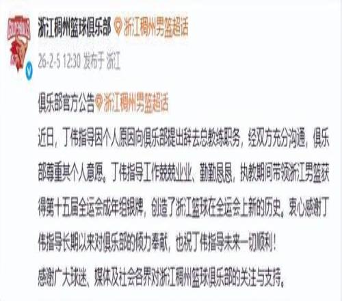 2月5日,浙江男篮官宣丁伟辞去总教练职务。这一次,CBA圈内没人感到意外——这已是他在浙江的第三次“下课”。