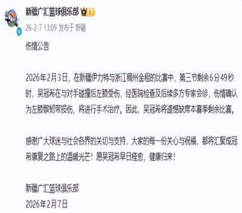 新疆男篮在公告中写道:“大家的每一份关心与祝福,都将汇聚成冠希康复之路上的温暖光芒!愿吴冠希早日痊愈,健康归来!”