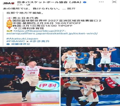 日本官方列出了世预赛对阵中国男篮和韩国队的比赛时间,并且写道:“在那个地方绝对不能输。”