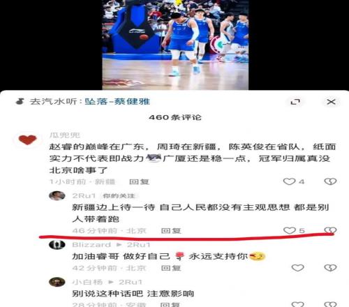 另一新疆球迷分析球队实力称,“赵睿的巅峰在广东,周琦在新疆,陈盈骏在省队,纸面实力不代表即战力,广厦还是稳一点,冠军归属真没北京啥事了。”