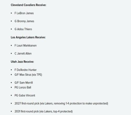 爵士得到:亨特、斯特鲁斯、梅里尔、朗佐-鲍尔、文森特、湖人2027年首轮签(移除前四顺位保护,变为无保护签)、湖人2031年首轮签(前四顺位保护)