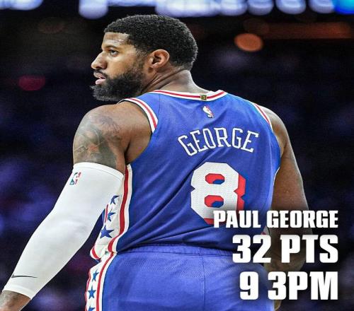 在本场之前,乔治本赛季一共为76人打了25场比赛,场均上场30.2分钟,只能得到15.4分5.3篮板3.6助攻,三项命中率41.5%/36.4%/86.5%,真实命中率54.8%。
