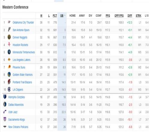不过湖人、太阳跟勇士的胜场还有2.5个差距还较大,快船跟灰熊的胜场已经拉开3.5个,快船附加赛的席位已经很稳,而且快船反超开拓者只是时间问题。