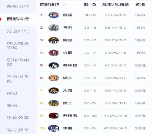 目前西部前十的排名:雷霆、马刺、掘金、火箭、森林狼、湖人、太阳、勇士、开拓者、快船。
