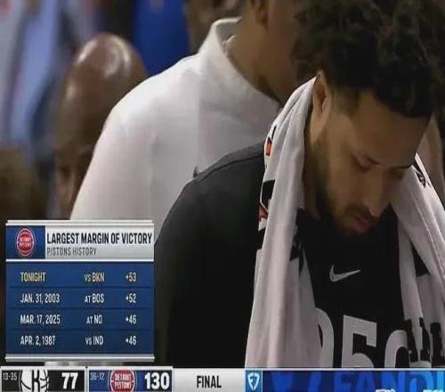 此役活塞赢了53分之多,创造队史单场最大赢球分差。