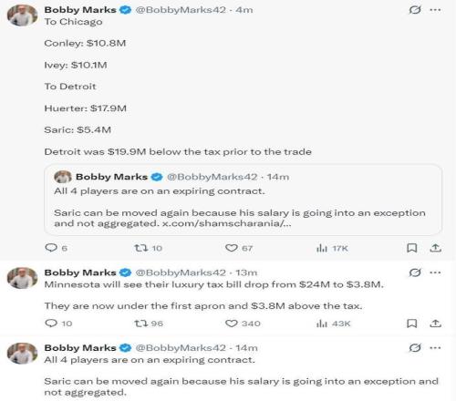 核心框架是:公牛送出23岁的后卫杰登·艾维,从森林狼得到38岁的控卫迈克·康利,活塞则从森林狼得到后卫凯文·赫尔特与前锋达里奥·萨里奇,森林狼作为促成交易的一方,主要收获是来自公牛的2026年首轮签互换权以及一个价值250万美元的交易特例。