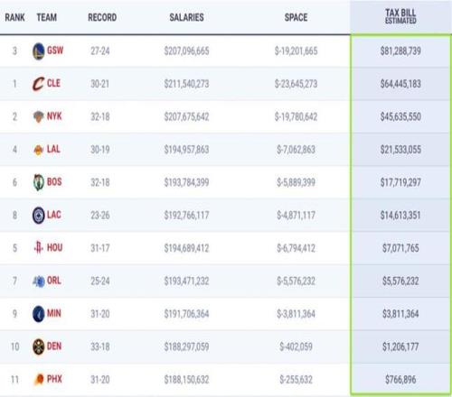 这让骑士队奢侈税降至联盟第二,勇士队8129万美元奢侈税正式登顶联盟第一。