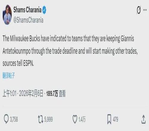 北京时间2月6日凌晨1点,据NBA名记Shams报道,雄鹿正式通知联盟各支球队,不会在交易截止日(今天凌晨4点)送走字母哥。另一记者Jake Fischer报道,一位与雄鹿谈判过的球队高管表示,雄鹿从来没有认真讨论过字母哥的交易。