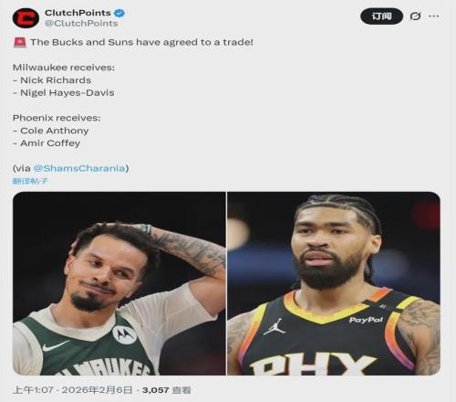 Shams:雄鹿将科尔安东尼和科菲交易至太阳,换来理查兹