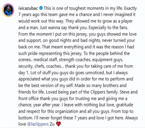 这是我人生中最艰难的时刻之一。整整七年前,这支球队给了我机会,我从未想过会以这样的方式结束。他们见证了我从一名球员到一个男人的成长蜕变。千言万语,唯有感谢。尤其要感谢球迷们。从我披上这件球衣的那一刻起,无论顺境逆境,你们始终对我倾注爱意与支持,从未离弃。这份情谊重于一切,也是我身披快船战袍时,心中满溢自豪的源泉。
