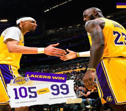 NBA常规赛继续进行,洛杉矶湖人队(32胜19负)继续连胜。勒布朗得到20分、7个篮板和10次助攻,里夫斯替补得到16分、5个篮板和8次助攻,他们率队依靠第三节高潮确立领先优势,湖人队在主场以105-99击败金州勇士队(28胜25负)。湖人队拿到3连胜。