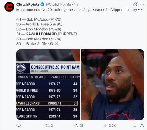此役还没开打,转播方给了一项数据,伦纳德已经连续31场20+快船队史第三,他还差一场就追平75-76赛季的麦卡杜连续32场20+,但首节他被阿门、伊森缠的挺厉害只拿到4分1助攻。