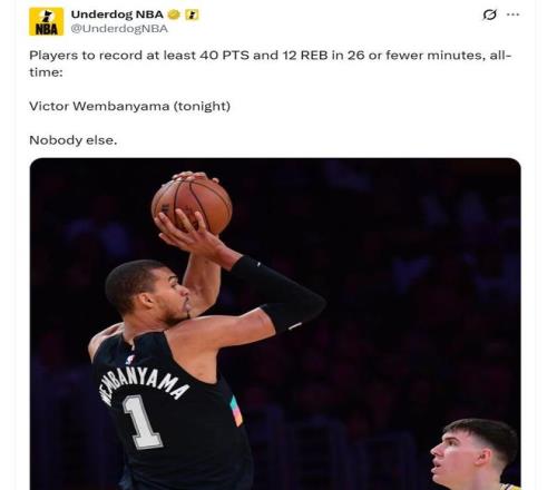 文班亚马40+12+4记3分创NBA历史第1神迹,还刷爆纪录,詹姆斯缺战,马刺完胜湖人!布朗尼12+6!