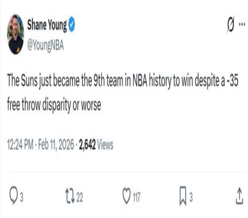 这让太阳队成为NBA历史上第9支在单场罚球数比对手少35+情况下,还能拿下胜利的球队。