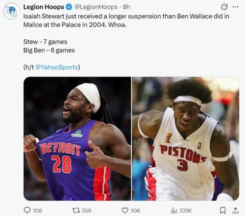 但也有人为斯图尔特发声,美媒Legion Hoops就感叹斯图尔特比当年奥本山宫殿事件中的本-华莱士被禁赛的场次还多。