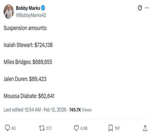 薪资专家Bobby Marks则火速计算出4名球员将因斗殴被禁赛带来的经济损失,4人合计损失超过150万美元。