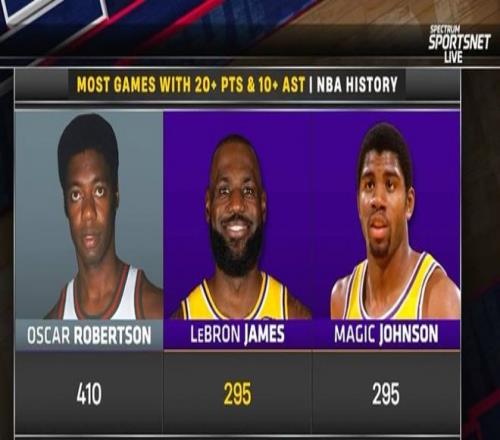 第三,历史20分10助场次榜:大O以410场排名第一,詹姆斯295场与魔术师并列第2。