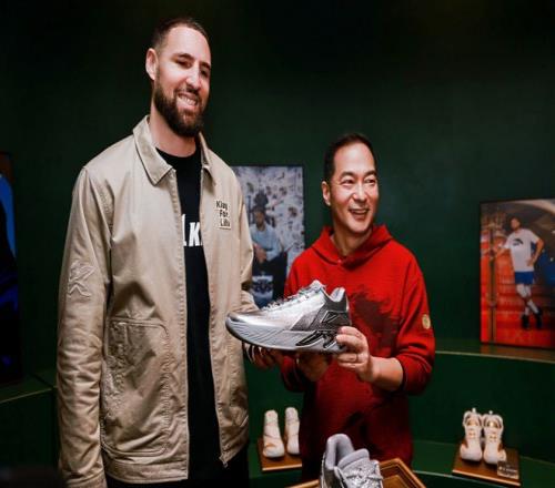 在北美旗舰店开业当日,代言人克莱·汤普森与KT11特别版球鞋合影 图片来源:安踏官方