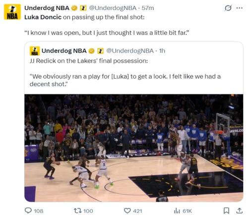 赛后雷迪克说湖人最后一攻就是为东契奇布置的战术,但东契奇为自己辩解:我知道那是一个空位,但是我觉得距离有点远。(东契奇的辩护显得苍白无力)