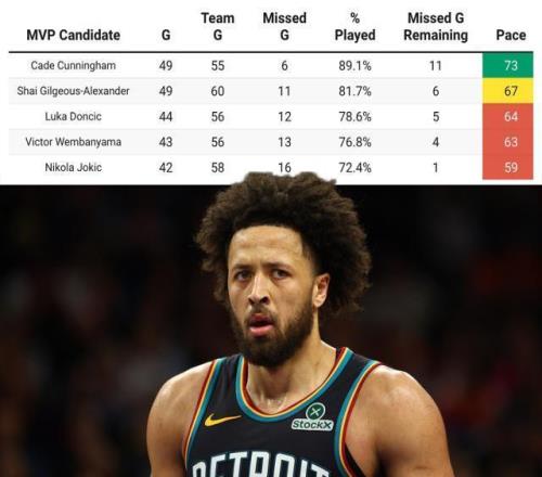 美国博彩公司的赔率显示,坎宁安获得MVP的概率正在不断增大,而过去一周看好他赢得MVP的玩家超过看好其他球员的总和。这不仅仅是因为坎宁安的出色表现和活塞联盟第一的战绩,还因为其他MVP大热门正面临出勤不达标的风险。