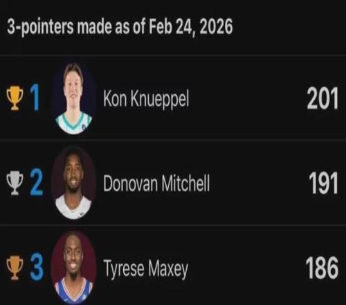 这哥们的确变态准,而且他只要再扔进6记三分球达到207记,就可以登顶NBA史上新秀三分王,22届首轮第四号秀基根-默里(国王)曾于22-23赛季出战80场比赛合计扔进206记三分球。