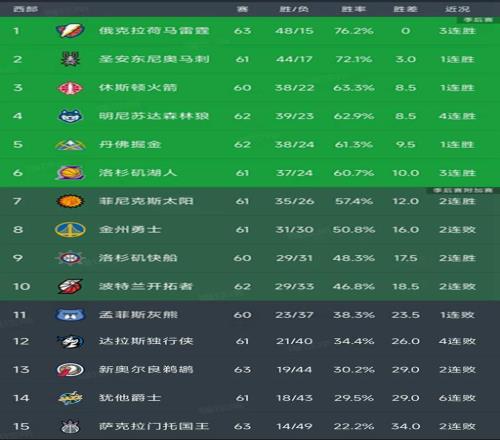 北京时间3月4日,随着湖人110-101鹈鹕、太阳114-103国王的比赛结束,今天的NBA常规赛结束了所有比赛,我们看看西部最新排名!