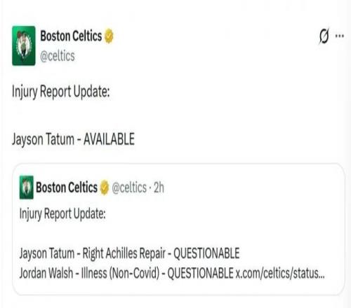 凯尔特人官宣,塔图姆今天确定出战!