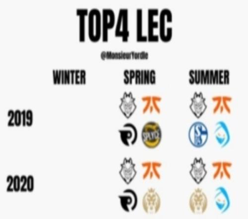 外媒统计2019年以来每赛季LEC前四队伍:G2从未缺席