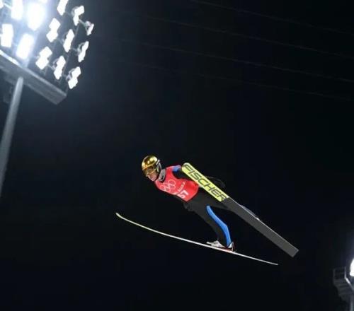 随后凭着惯性从跳台边缘一跃而出,在空中滑翔一段距离后,最后降落到雪地上。