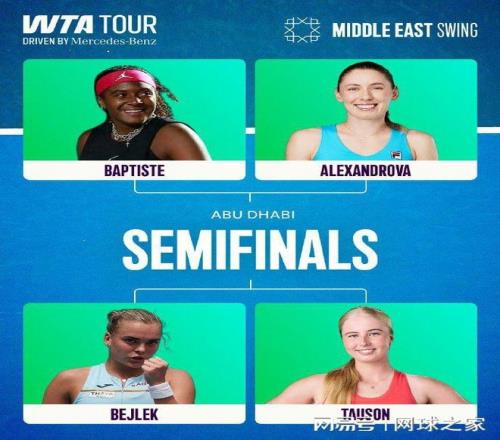 女子赛场:在WTA500阿布扎比站单打1/4决赛中,2号种子、俄罗斯名将亚历山德洛娃以6-3 6-3击败菲律宾一姐伊埃拉,挺进半决赛将战持外卡出战的美国人巴普蒂斯特,后者以6-2 4-6 6-4爆冷淘汰5号种子、俄罗斯人萨姆索诺娃,本周连胜两位TOP20球员,打进职业生涯首个巡回赛四强。另外两场较量,资格赛球员贝莱克和丹麦新星陶森分别战胜各自对手,会师半决赛。