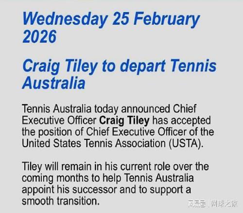 北京时间今晨,澳大利亚网球协会宣布,其首席执行官兼澳网赛事总监克雷格-泰利已接受美国网球协会(USTA)首席执行官一职,将在数月内走马上任。在接下来的几个月时间里,泰利将继续留任现职务,并帮助澳大利亚网球协会物色继任者,协助完成平稳过渡。
