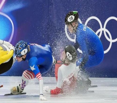 那是女子1500米四分之一决赛,短道速滑本来就险,选手贴着冰面飞。快到终点时,美国选手桑托斯-格里斯沃尔德一个动作引发连环撞,包括意大利名将丰塔纳在内的好几个人摔成一团。