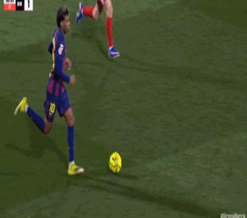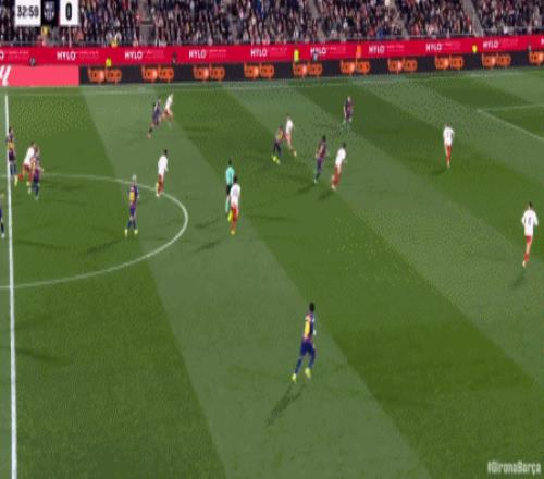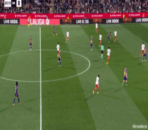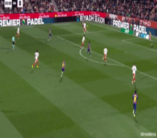 第34分钟,拉菲尼亚直塞,费尔明小角度打门踢飞