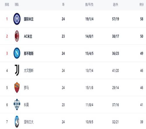在积分榜上,国际米兰以58分排名榜首,战绩是19胜1平4负。国际米兰虽然输球的场次不算少,但平局极少,赢球的场次联赛最多,让国际米兰得以占据第1的位置。AC米兰只拿到50分,排名第2,足足落后了8分。不过,A米兰少踢1场。
