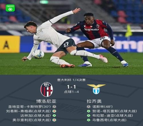 北京时间2月12日意大利杯 1/4决赛,博洛尼亚对阵拉齐奥。博洛尼亚圣地亚哥-卡斯特罗破门。拉齐奥诺斯林破门。最终比分博洛尼亚 2-5 拉齐奥。