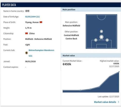 去年1月加盟西海岸时,徐彬的评估身价为12.5万欧元。2025赛季,徐彬在中超出场27次,其中21次首发,总共送出3次助攻,帮助西海岸取得中超第九的队史最佳战绩。