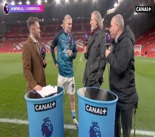 英超第25轮,曼城客场2-1战胜利物浦,曼城前锋哈兰德赛后接受了CANAL+体育的采访。