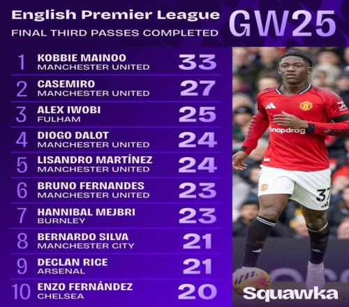 英超第25轮进攻三区传球成功次数榜