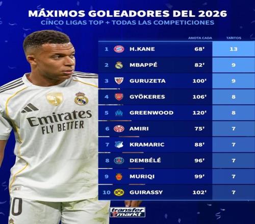 北京时间2月24日,德转统计出了2026年至今欧洲五大联赛球员各项赛事的进球榜,哈里-凯恩以13球排名第一,姆巴佩9球位列第二,哲凯赖什、格林伍德、登贝莱以及吉拉西上榜。