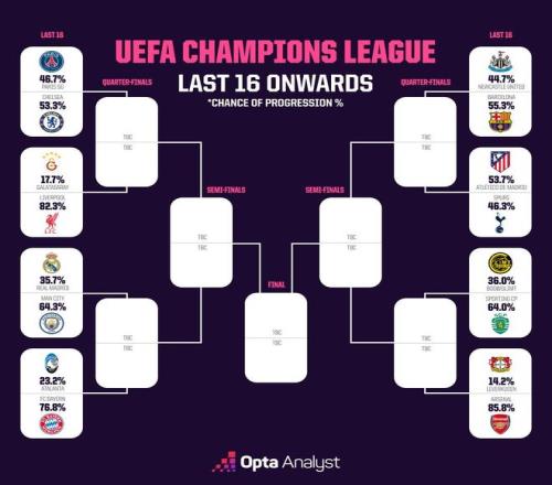 欧冠淘汰赛抽签结果出炉后,知名数据机构Opta预测了各队晋级八强的概率。